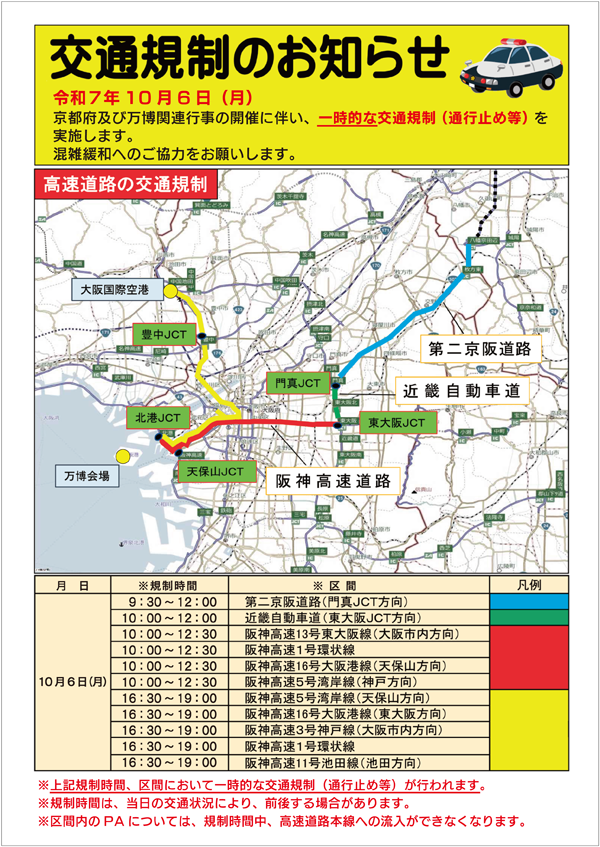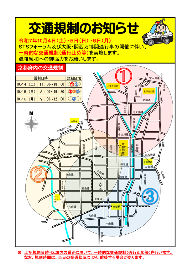 STSフォーラム(京都府)及び大阪・関西万博関連行事の開催に伴い、京都府内で10月4日(土)、5日(日)、6日(月)、大阪府内で10月6日(月)に広範囲で一時的な交通規制が実施されますので、お知らせします。