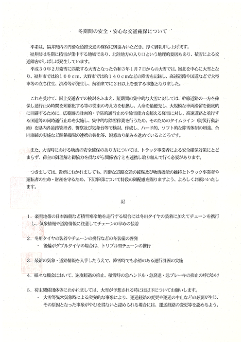 福井河川国道事務所等より、「冬期間の安全・安心な交通確保」についての要請がありました。